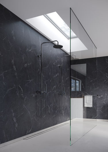 Unlike traditional marble tile installations, Black Marble panels install using Fibo’s Aqualock click system, forming a fully sealed wall surface without grout lines. This grout-free installation reduces long-term maintenance while preserving the clean, seamless look of natural stone.
